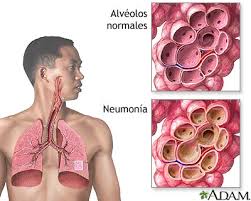- Neumonía: es una infección aguda de los espacios alveolares, causada por bacterias patógenas y virus. Si la infección se circunscribe a los alvéolos contiguos a los bronquios, se denomina Bronconeumonía.