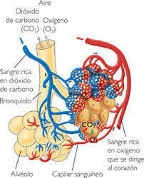 El oxígeno se extiende en el torrente sanguíneo donde es captado por la hemoglobina de los hematíes que se transforma en oxihemoglobina. A la vez se libera anhídrido carbónico, recogido por la sangre en los tejidos y disuelto en el plasma. Así en un estado natural de reposo se ponen en contacto al mínimo 5 litros de sangre con 4 litros de aire.